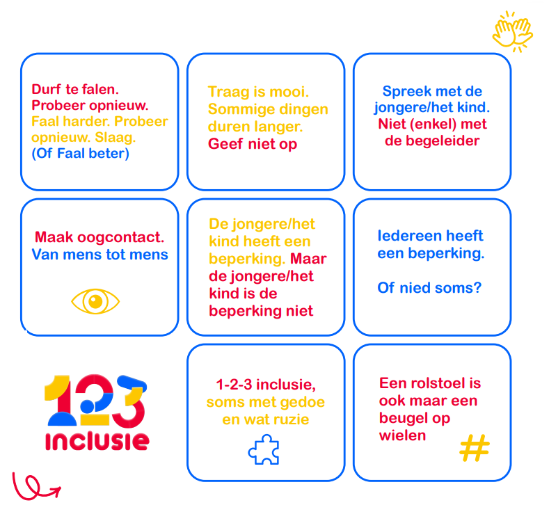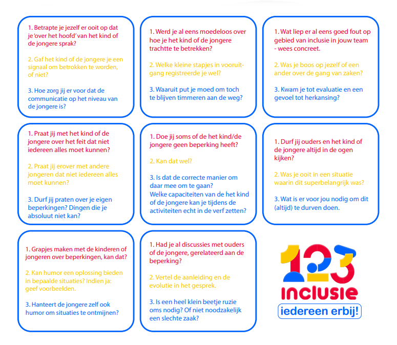 Het is belangrijk om goed te reflecteren, ervaringen te delen en in gesprek te gaan met elkaar over dit thema. De campagne 123inclusie ontwikkelde een spel om met je collega’s, je medeleiding, je klas te spel... Knip de kaartjes uit, leg ze op tafel en luister!